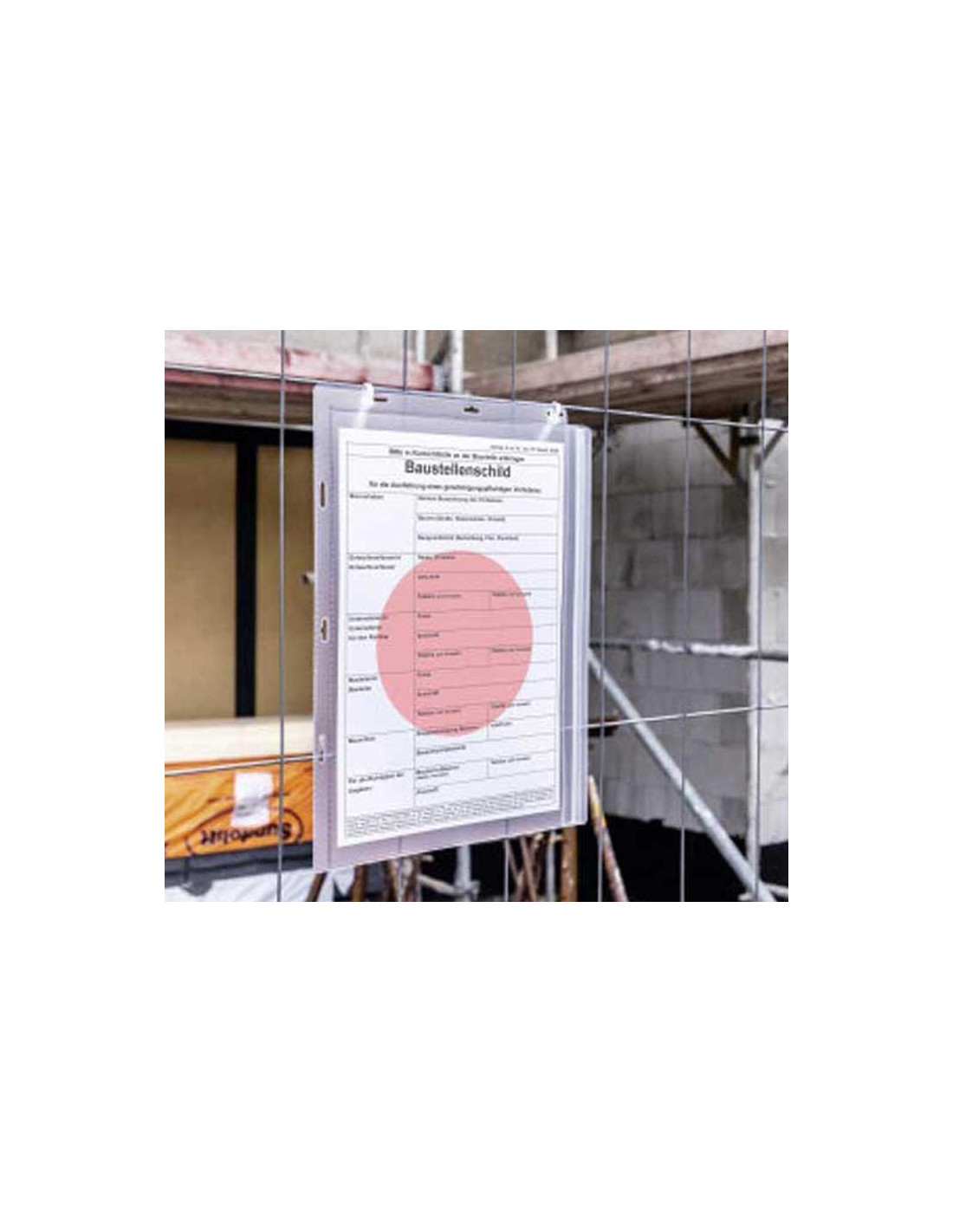 Funda informativa impermeable, ideal para mostrar información en exteriores, como centros de jardinería, saunas, piscinas, puertas y tablones de anuncios, donde acostumbra a haber salpicaduras de agua. El cierre hermético a presión protege el contenido de la funda, especialmente de la lluvia, humedad y polvo. Fijación: la funda contiene perforaciones para utilizar con un par de bridas (incluidas también en el envase). Protección IPX5 contra chorros de agua de cualquier dirección. Fabricada con plástico transparente con estabilización UV, resistente a la intemperie y a los arañazos, con tratamiento anti reflectante. Se puede usar en horizontal y en vertical. Fácil y rápido intercambio de contenido. Capacidad: 2 hojas 160 g/m2.