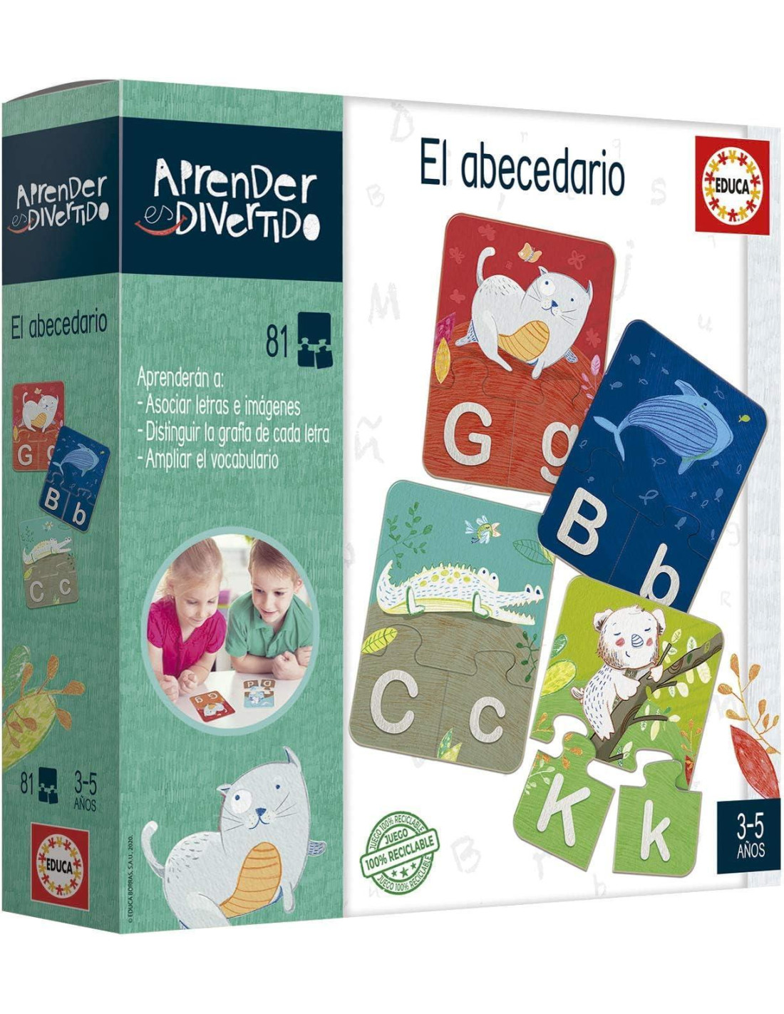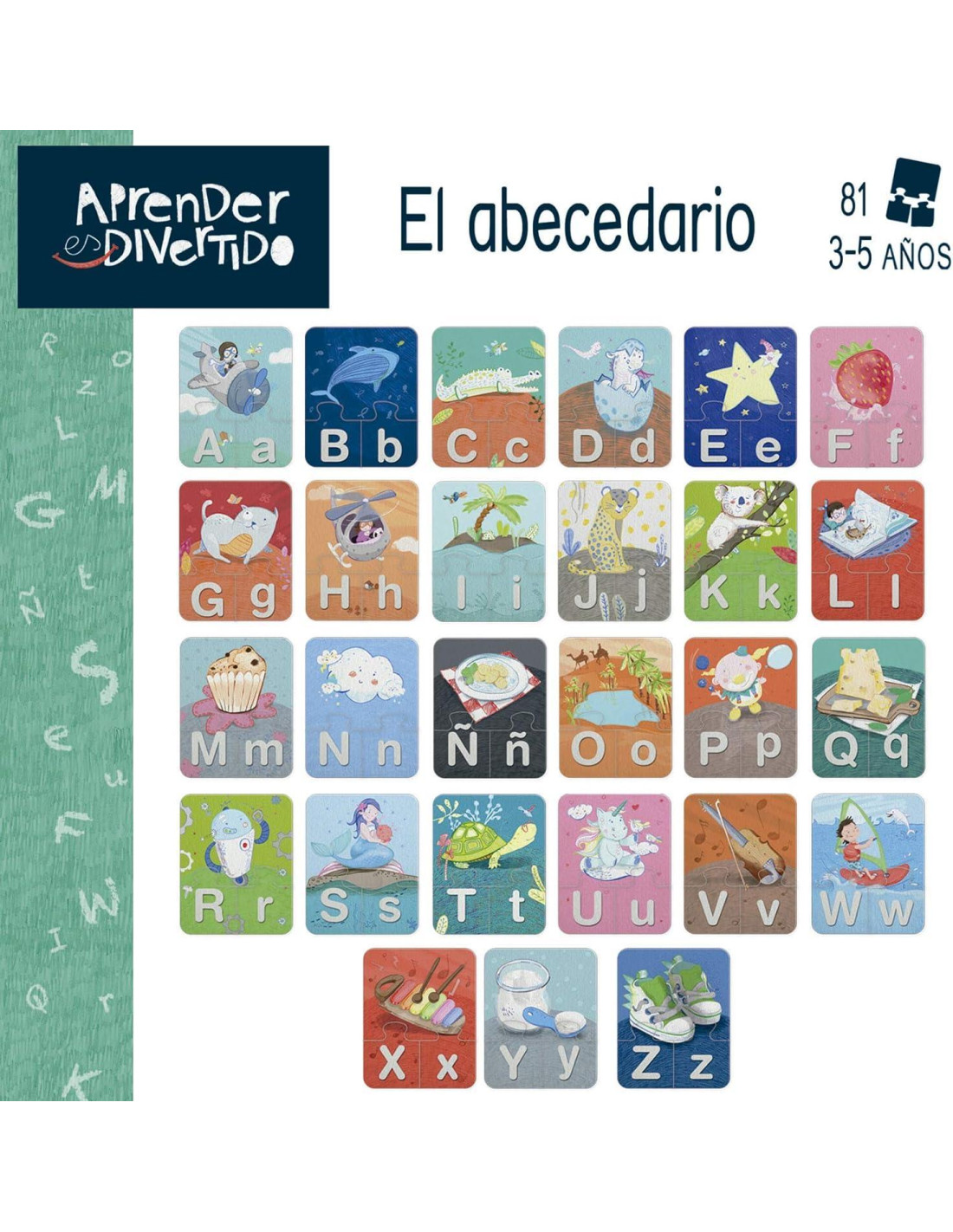 Juego en forma de puzzle, con 81 piezas que forman 27 encajables relacionados con el abecedario. Fabricado en cartón resistente. Ayuda a desarrollar la coordinación, la motricidad fina, la solución de problemas, el reconocimiento de formas, la memoria y a alcanzar pequeños objetivos. Edad recomendada a partir de 3 años.