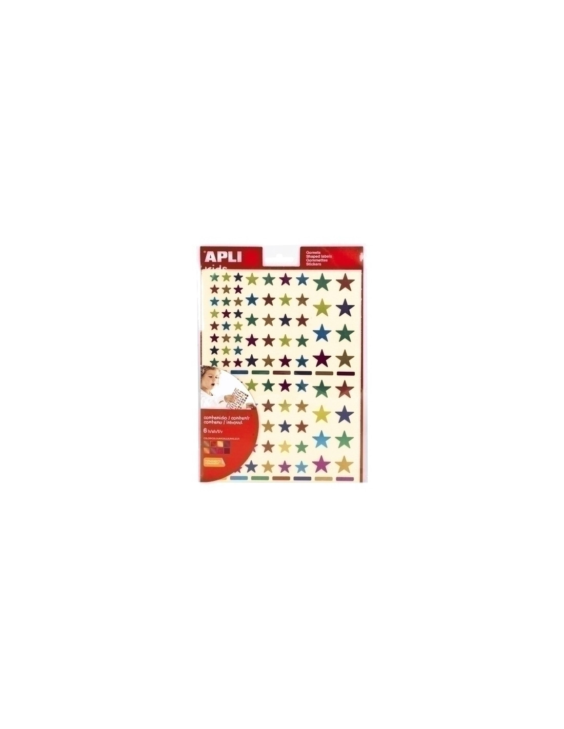 Bolsa de Gomets con adhesivo permanente en forma de estrella en diferentes colores metalizados y en tres tamaños surtidos (10,14 y 20 mm). Gomets multicolor metalizados para que los más pequeños comiencen a conocer formas, colores y tamaños. Una actividad que permite desarrollar la psicomotricidad fina, desarrollar la lógica y la creatividad, y fomentar el trabajo en equipo. Se fabrican conforme a las normas EN-71 y a la cadena de custodia FSC. Adhesivo base agua. Libre de disolventes. Papeles ECF (Elemental Chlorine Free). Materiales 100% reciclables.