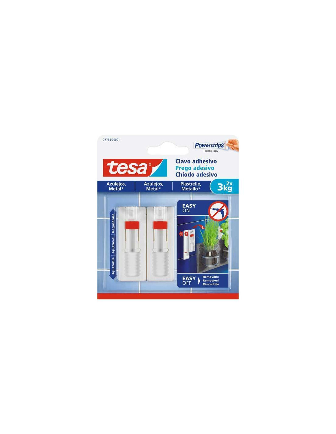 - Clavos adhesivos - Para azulejos y metal - Altura ajustable - Cada clavo soporta hasta 3kg. - Son ideales para colgar de forma rápida - Tecnología Powerstrip® - Se retiran sin dejar rastro - Son reutilizables con una nueva tira