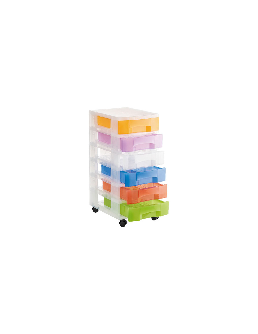 Torre de almacenaje con 6 cajones de 6 litros con ruedas. Fabricada en polipropileno copolímero, con aditivo antiestático que facilita la limpieza y evita la acumulación de polvo. Destaca por su gran resistencia y estabilidad. Ideales para el hogar, la oficina, centros educativos, clínicas, hospitales, etc. Carcasa en color cristal translúcido y cajones en color translúcido. Medidas interiores de los cajones: 342x220x79mm. Medidas exteriores: 390x290x685mm. Fabricado en España