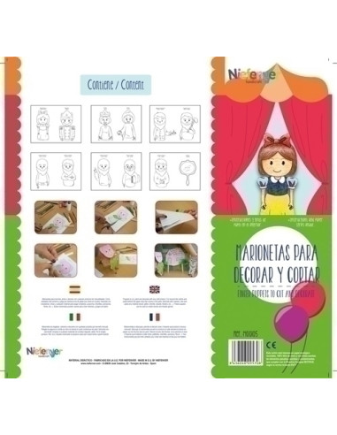 Marioneta de dedos fabricadas en cartulina de 300 gramos con un tamaño de 297 x 210 mm. Tienes que pintar, recortar, decorar y representar este cuento infantil de principio a fin con la ayuda de tu imaginación. Personajes: Blancanieves, príncipe, reina, bruja, enanitos: dormilón, feliz, perezoso, gruñón, mudito, sabio, travieso y espejo.