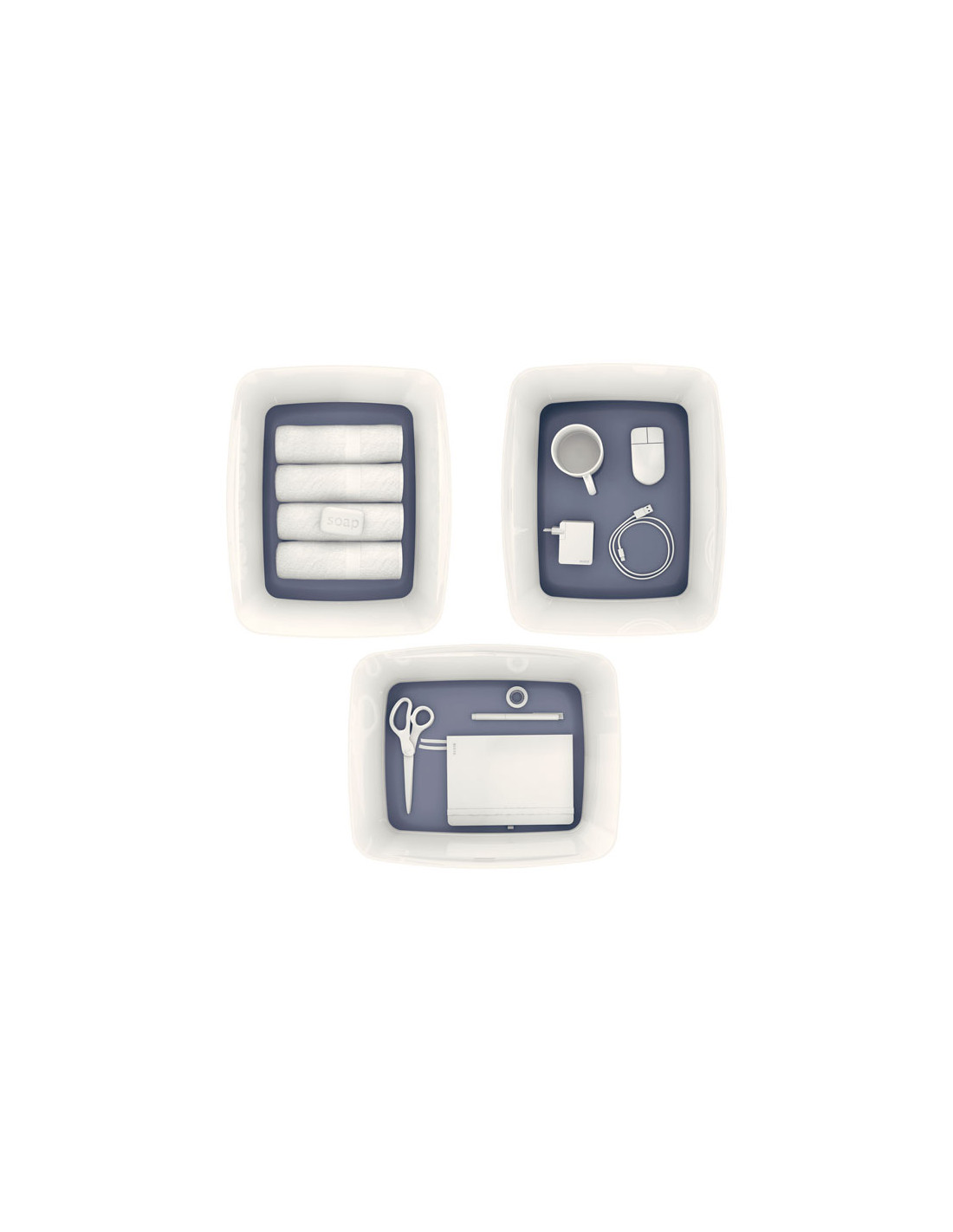 Caja de almacenaje modular bicolor de diseño moderno y acabado brillante resistente a los arañazos, para almacenar de forma rápida documentos, revistas, ropa, juguetes y otros accesorios. Ideal para una organización minimalista en casa o en la oficina. Fabricada con robusto material impermeable. Apto para uso alimentario. Sin BPA. Solución de almacenaje flexible para utilizar en casa, la oficina, el baño, la sala de reuniones, etc. Cabe en estanterías de tamaño estándar y debajo de la cama. Se pueden apilar hasta 4 cajas, fácil de transportar y reorganizar. Fácil de limpiar, alta resistencia al agua. Posibilidad de añadir compartimentos y bandejas de organización de la misma colección MyBox, que encajan perfectamente en la caja para separar el contenido. Dimensiones exteriores: 31,8x19,8x38,5cm, Internas: 24,3x19,8x31,8cm. Capacidad: 18 litros.