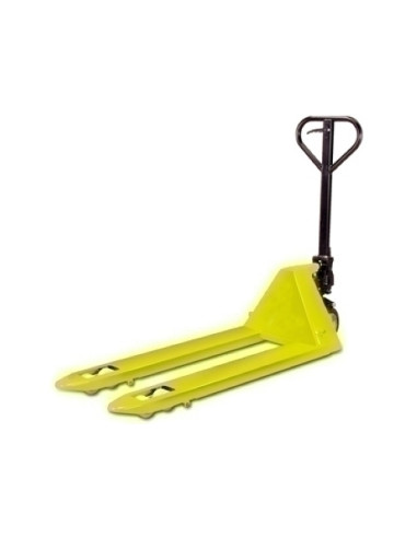 Transpaleta manual con pala larga con capacidad para 2200 kg, diseño robusto para un trabajo intensivo. Horquillas reforzadas para ofrecer una mayor resistencia y extremos achaflanados para facilitar la entrada al palet (1150 x 525 mm). Pintura de alta calidad. Equipada con válvula de seguridad por sobrecarga, sistema de descanso controlado, pistón cromado y cuatro ruedas. Palanca equipada con resorte recupera la posición vertical automáticamente. Conforme con normativas: CE, GS y TÜV.