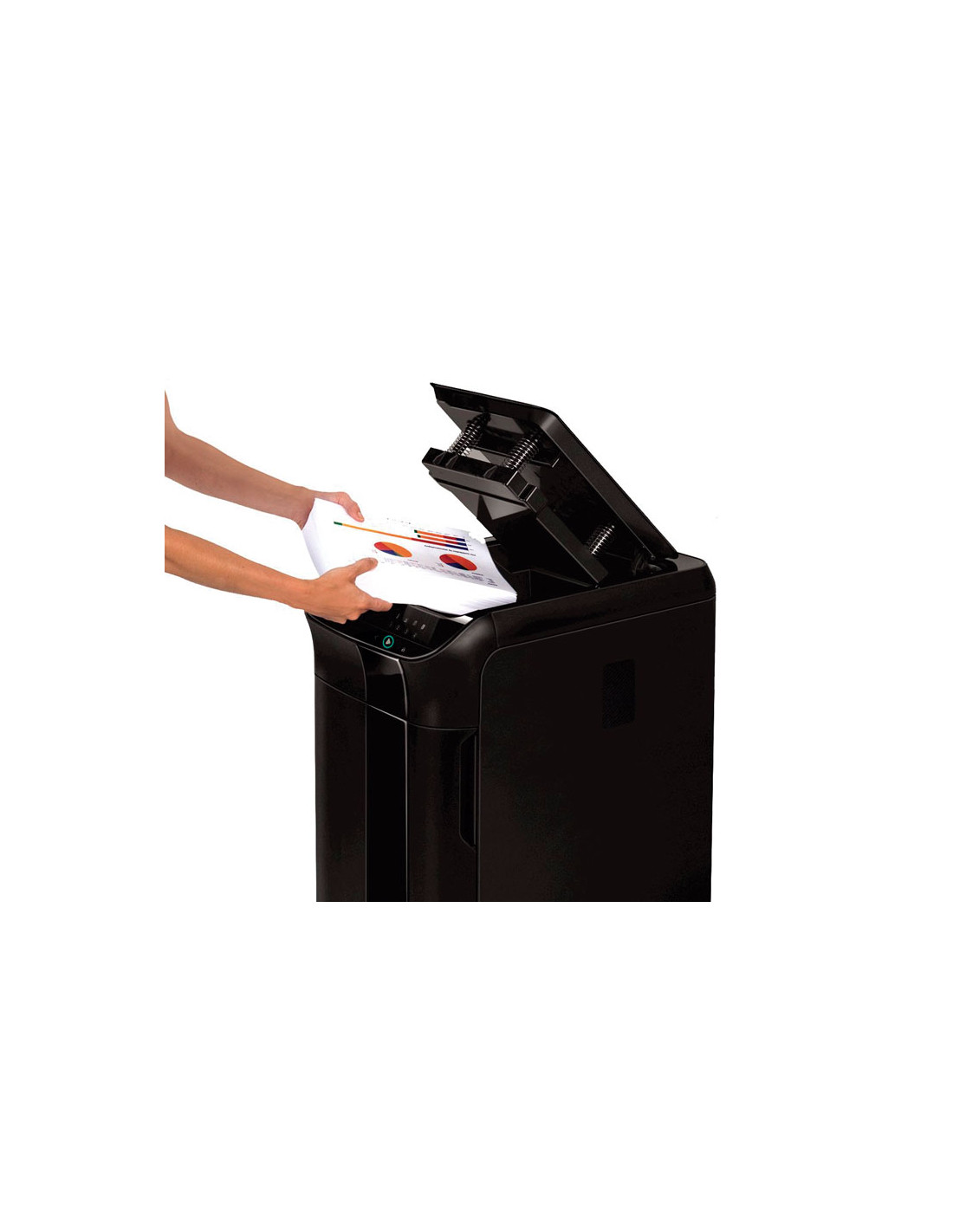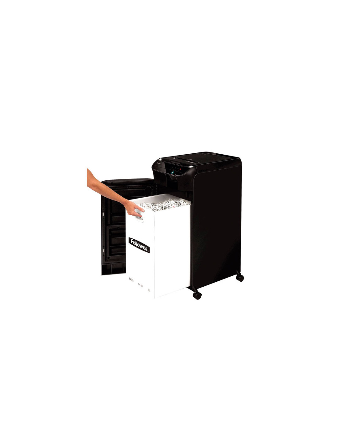 Destructora automática de documentos para uso profesional e intensivo l (+5 usuarios). Destruye hasta 550 hojas automáticamente y 14 hojas manualmente en partículas de 4x38mm (Nivel de Seguridad P-4). Bloqueo del cajón de alimentación del papel, con un pin de 4 dígitos para prevenir que se acceda a la información mientras dure el proceso de destrucción. Ciclo de trabajo continuo, destruye una carga de papel de 550 hojas en aproximadamente 13 minutos. Papelera de 83 litros y ancho de entrada de 23cm. Destruye grapas, tarjetas de crédito y CD's/DVD's. Dimensiones 89,06x44,13x57,79cm. Garantía de 2 años para la máquina y 20 años de garantía para las cuchillas.
