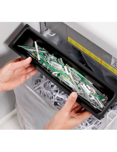 - Destructora de documentos confortable para grandes volúmenes - Sistema de filtro de partículas único DAHLE CleanTEC® - Ancho de entrada 310 mm - Potencia 900 W - Capacidad 140 litros - Capacidad de corte 35h de 80gr - Corte en tiras - Función de retroceso automática - Parada del motor automática al llenarse la bolsa recolectora o puerta abierta - Rodillos de corte de acero de alta calidad - Ranura y depósito recolector de CD independiente - Funcionamiento sumamente silencioso para un ambiente de trabajo más tranquilo - Ruedas orientables para mayor comodidad - German Engineering by Dahle