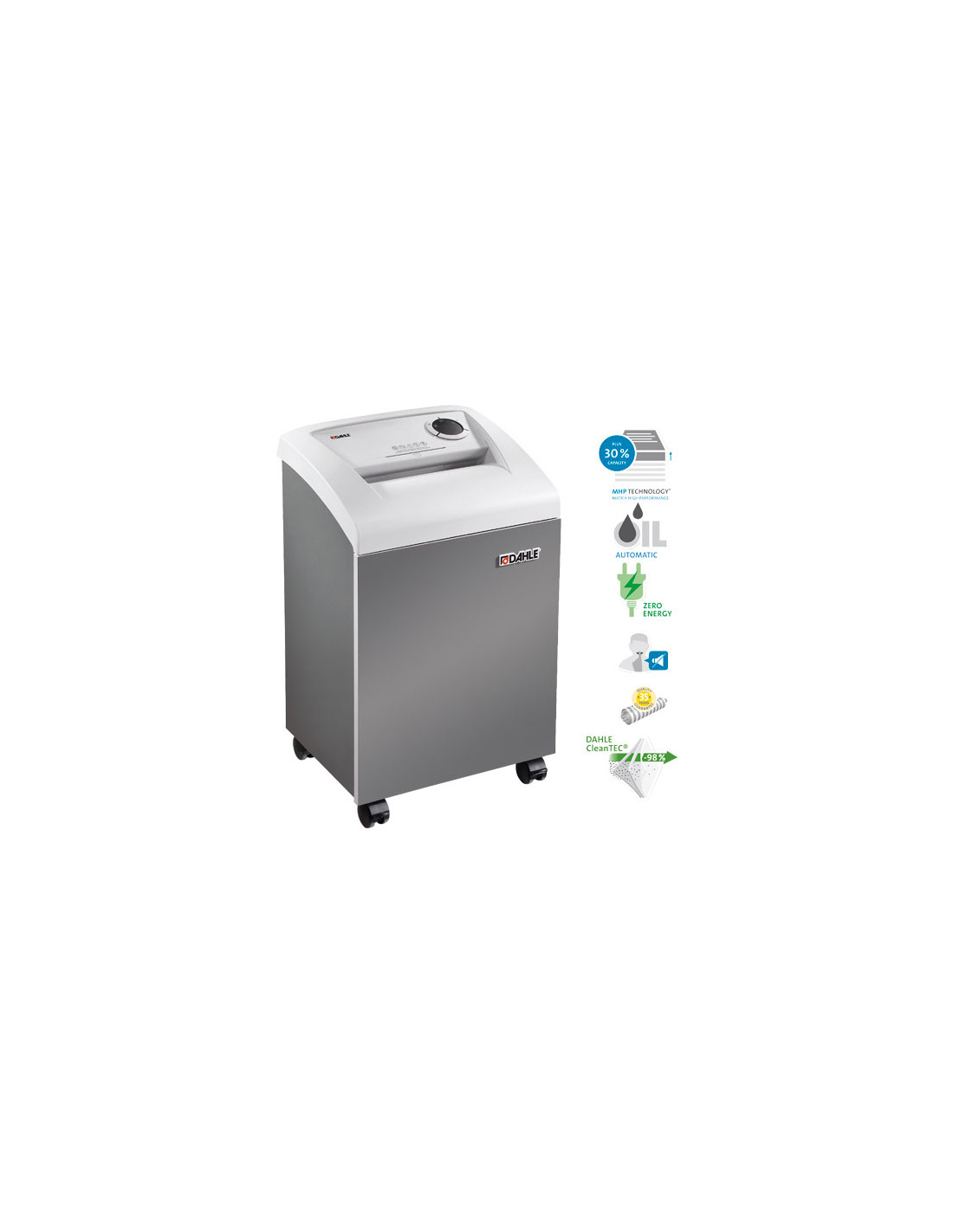 - Destructora de oficina inteligente para el uso en el escritorio - Sistema de filtro de partículas único DAHLE CleanTEC® - Depósito de aceite integrado para un lubricado automático controlado de los rodillos de corte - Ancho de entrada 240 mm - Potencia 350 W - Capacidad 40 litros - Corte en partículas - Capacidad de corte 5h de 80gr - Función de retroceso automática - Parada del motor automática al llenarse la bolsa recolectora o estandola puerta abierta - Modo Standby después de 10 minutos de inactividad y desconexión automática después de 30 minutos - Rodillos de corte de acero de alta calidad (35 años de garantía para los rodillos de corte) - Funcionamiento sumamente silencioso para un ambiente de trabajo más tranquilo - Ruedas orientables para mayor comodidad - German Engineering by Dahle