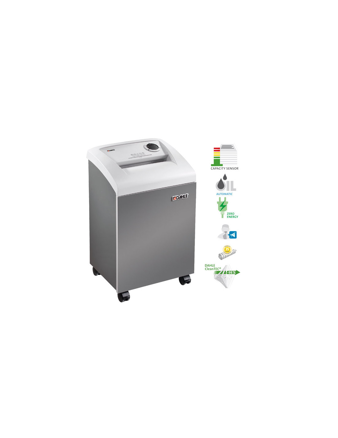 - Destructora de documentos departamental - Sistema de filtro de partículas único DAHLE CleanTEC® - Depósito de aceite integrado para un lubricado automático controlado de los rodillos de corte - Ancho de entrada 240 mm - Potencia 350 W - Capacidad 40 litros - Súper microcorte - Capacidad de corte 2h de 80gr - Función de retroceso automática - Parada del motor automática al llenarse la bolsa recolectora o estandola puerta abierta - Modo Standby después de 10 minutos de inactividad y desconexión automática después de 30 minutos - Rodillos de corte de acero de alta calidad (35 años de garantía para los rodillos de corte) - Funcionamiento sumamente silencioso para un ambiente de trabajo más tranquilo - Ruedas orientables para mayor comodidad - German Engineering by Dahle