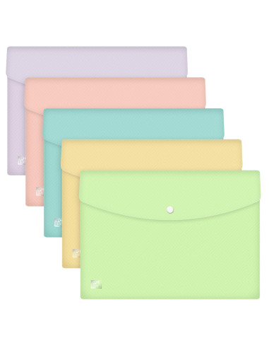 - Sobres de plástico translúcido flexible - Cierre con broche - Capacidad de hasta 40 hojas - Formato A4 - Pack 5 sobres colores pastel