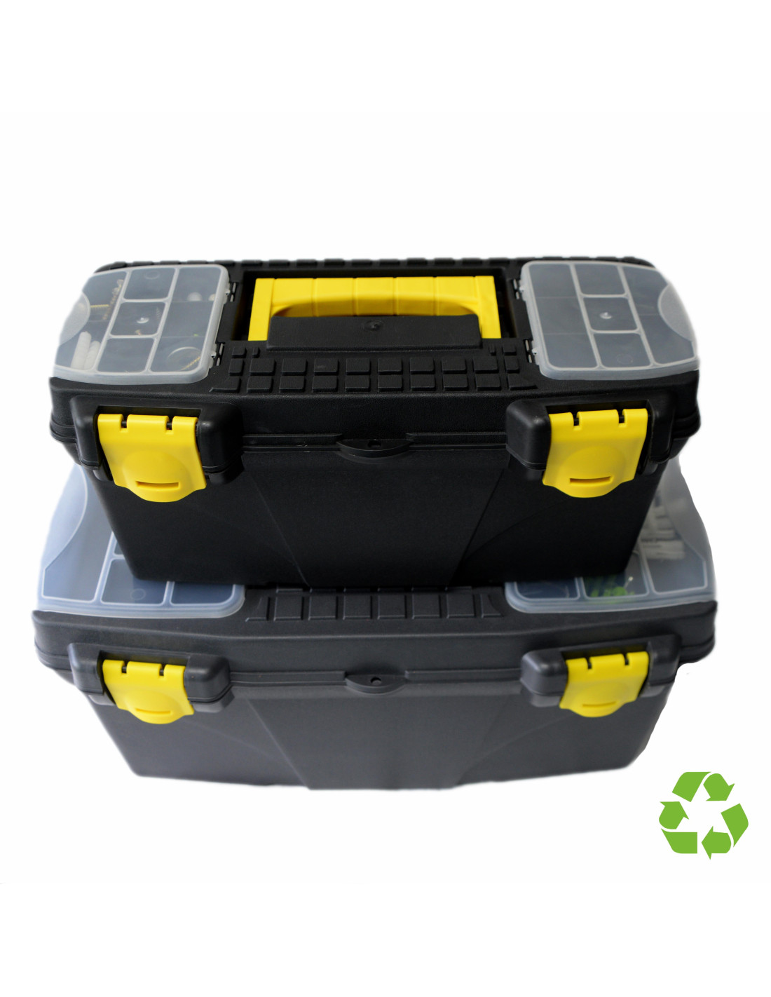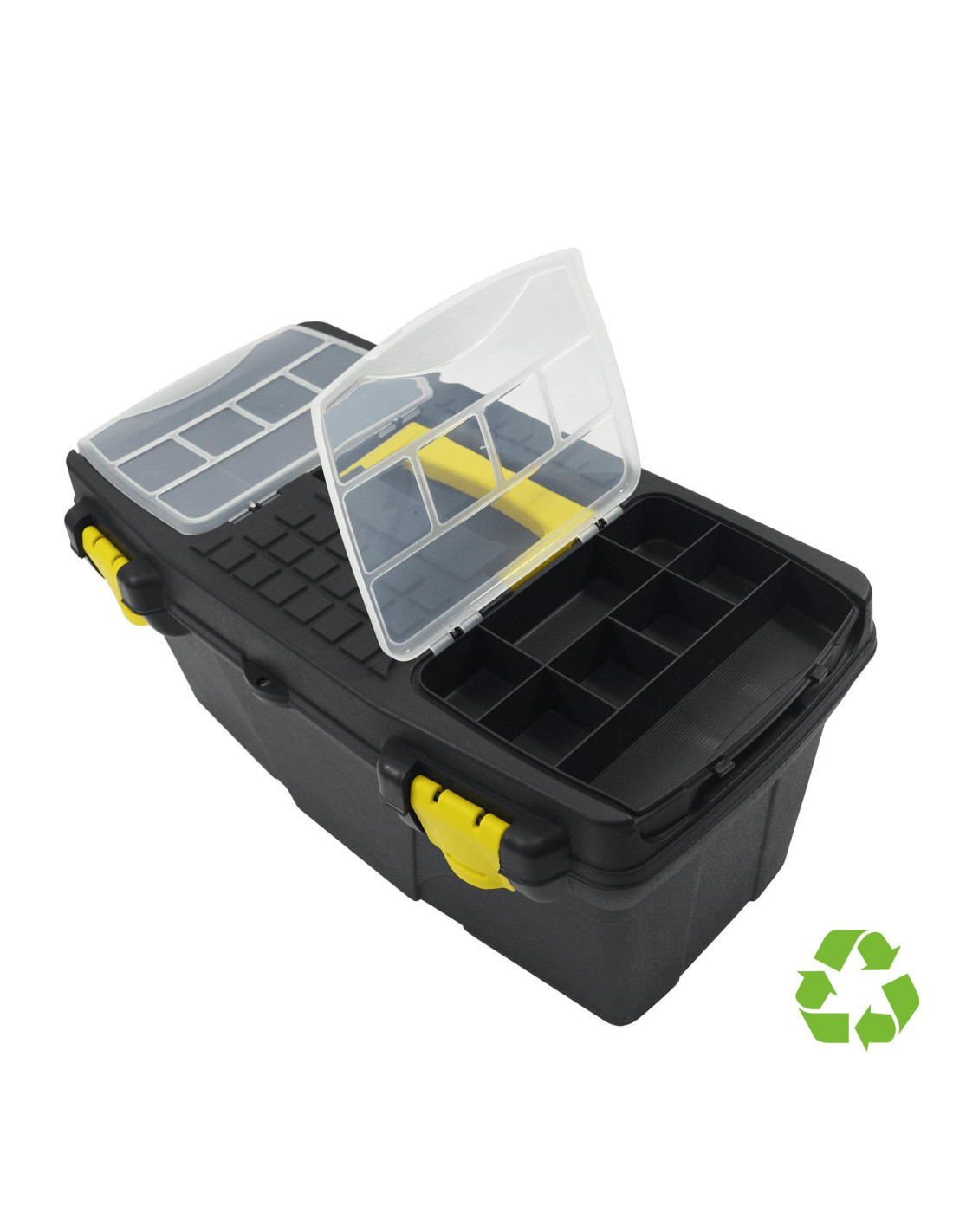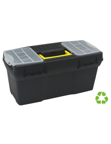 - Caja de herramientas sostenible - Fabricada en polipropileno reciclado y 100% reciclable - Muy resistente y robusta - Con bandeja organizadora y varios compartimentos - Muy ligera - Formato S: dimensiones exteriores: 19x39x18cm.