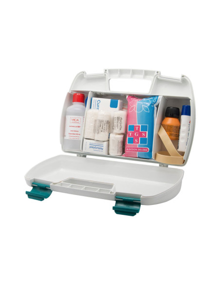 - Maleta de primeros auxilios fabricada en polipropileno - Con asa y separadores interiores fijos. - Contenido : * 1 ud Agua oxigenada 250 ml * 1 ud Alcohol 96º etilico 250 ml * 1 ud Algodon zig zag 25 g * 2 ud Compresa est 15x26 8c 5ui 20h ph 2 * 1 pack Curatinas plástico 15 ud * 1 ud Goma smarch latex * 1 pack Guante latex * 1 ud Naturplast tela blanco 5x 1,25 * 1 ud Pinza diseccion s/d 13 cm * 1 ud Povidona yodada 50 ml * 1 ud Tijera mango plástico 13cm usc * 5 ud Venda malla extra 5 x 5