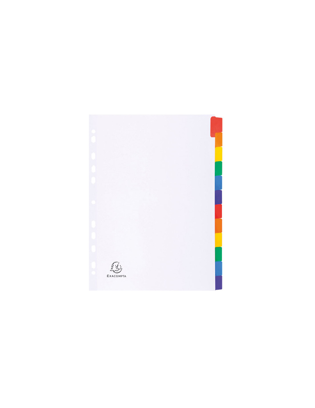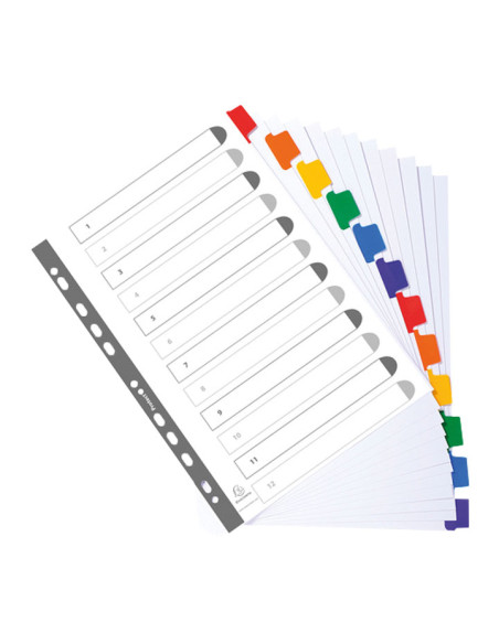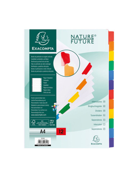 - Separadores en cartulina blanca - Gramaje de 160 g. - Con pestañas reforzadas en color - Multitaladro reforzado - Incluye índice imprimible - Software online. “Kreaman”. www.exacompta.com - Formato: A4 - Posiciones: 12