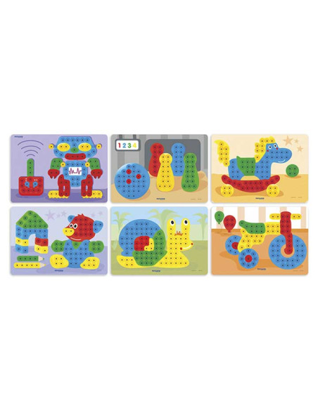 - Láminas con modelos - Ideas para mosaicos - Colores básicos - Edad recomendada de 3 a 6 años - Ideal * Motricidad fina * Coordinación Mano-Ojo * Destreza manual * Creatividad e imaginación * Orientación espacial * Reconocimiento de colores
