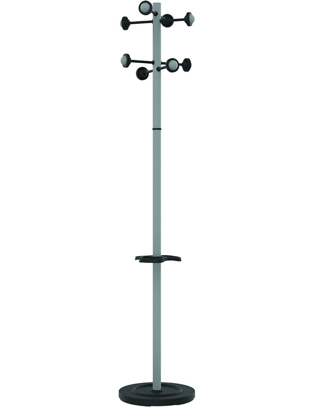 Perchero de pie perfecto para las oficinas de espacios abiertos. fabricado en acero con acabado suave. Cabezal giratorio, equipado con 8 colgadores redondeados para facilitar el colgado. Perchas con bordes antideslizantes y diseñadas para evitar deformar la ropa, reforzadas y hechas de una sola pieza. Con paragüero y bandeja antigoteo integrado, ajustable en altura con capacidad de hasta 9 paraguas. Base de ø34 cm y 6 kg de peso que asegura la estabilidad del perchero. Medidas: 175x34cm.