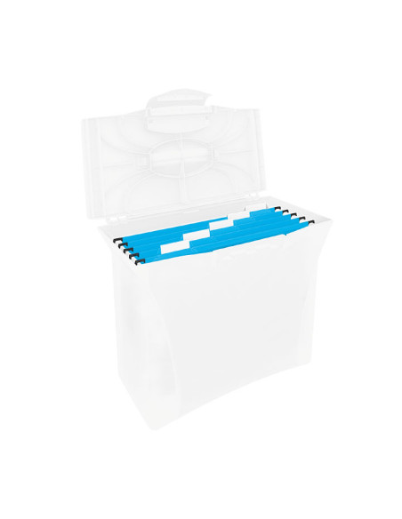 Maletín para archivar hasta 15 carpetas colgantes llenas. Con cierre de seguridad y asa integrada para su fácil transporte. Se suministra con 5 carpetas colgantes A4 y sus visores. Apilable para ahorrar espacio. También puede utilizarse sin las carpetas como caja de almacenamiento multiuso.