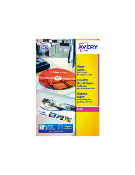 Etiquetas autoadhesivas blancas brillantes, con calidad de impresión fotográfica Colores brillantes y textos nítidos. Personaliza tus productos de alta calidad para resaltar los colores. Crea e imprime tus etiquetas con el software gratuito de Avery. 1 etiqueta por hoja- caja de 40 etiquetas. Para impresora láser.