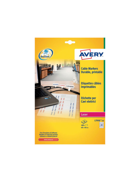 Etiquetas adhesivas blanca sujetacables. Permite localizar rápidamente y organizar el entramado de cables de un hogar y oficina. Fabricadas en poliéster y soportan las condiciones más extremas: humedad, bajas y altas temperaturas, aceites, grasas, rayos UVA, detergentes. Ideales parar uso interiores y exteriores Crea e imprime tus etiquetas con el software gratuito de Avery. 24 etiquetas por hoja Caja de 480 etiquetas. Para impresora láser.