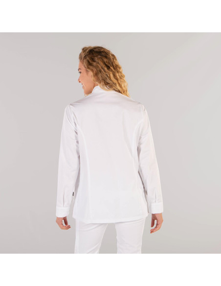- Blusa de mujer tipo casaca de manga larga - Cuello mao y puños abotonados. - Con corchetes vistos en el cuello - Dos bolsillos entre costadillos - Corte semi ajustado - Fabricado en un 65% sarga y 35% PES CO - 200gr/m2. - Es ideal para uniformes de ámbitos sanitarios y estética - ¿Quieres personalizar esta prenda con tu marca? ¡Consúltanos!