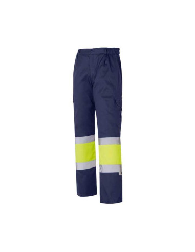Pantalón multibolsillos fabricado en sarga 100% algodón y la parte flúor con 40% poliéster y 60% algodón. Laterales elásticos en cintura, cierre de botón y cremallera. Con 2 bandas reflectantes horizontales en perneras de 5cm. de ancho. Bolsillos: 2 delanteros, 2 traseros con cierre de botón, 2 en perneras con cierre de velcro. Certificado EN ISO 13688/13 para ropa de protección, requisitos generales. Certificado EN ISO 20471/2013+A1/16 para ropa de alta visibilidad. Certificado Oeko-Tex® Standard 100.