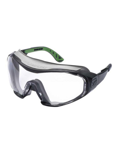 Gafa de protección, ofrece una versatilidad absoluta con la opción de usar las patillas regulables equipadas con tecnología SoftPad y la banda elástica incluida. La comodidad y facilidad de uso se suman a la protección contra caídas, aerosoles y partículas de polvo grandes garantizadas por el diseño especial de la goma interna. Amplio campo visual de 40 sin distorsiones. Certificado según la norma EN 166 punto 3 (gotas y salpicaduras) y punto 4 (polvo de gran tamaño). Protección contra gotas y salpicaduras de líquidos (3). Protección contra las partículas A.V. – a temperaturas "extremas" (T). Protección contra las partículas a alta velocidad – baja energía (F). Protección contra partículas de polvo de grandes dimensiones (5micron) (4). Resistencia al empañamiento (N). Resistencia al deterioro de las superficies por partículas finas (K). Protección UV 380 VLT% (+/-5%) 91.2. Categoría CE: CAT II.