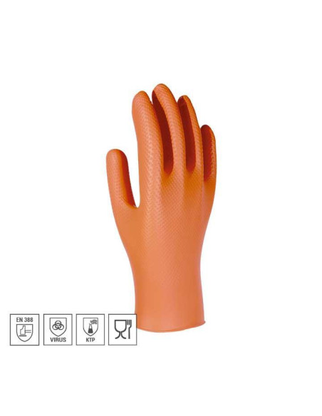 Guantes desechables de protección química tipo B, fabricados en nitrilo. Gran agarre gracias a su texturizado en palma y dorso tipo diamante. Gran resistencia al desgarro superior a un desechable tradicional. Aptos para uso alimentario según Reglamento (UE) 10/2011. No estériles y libres de siliconas. No contienen proteínas y son ambidextros. 240mm. longitud mínima. Aptos para hospitales (para exámenes), laboratorios, diagnosis, terapia, limpieza, pintura en spray, jardinería, agricultura, horticultura, talleres, mantenimiento y para el manejo de todo tipo de alimentos. Protección frente a químicos 374-1 Tipo B: (K) Hidróxido sódico (40%): Nivel 6, (P) Peróxido de hidrógeno (30%): Nivel 4, (T) Formaldehído (37%): Nivel 5. Protección frente microorganismos EN ISO-374-5. Categoría CE: Cat III.