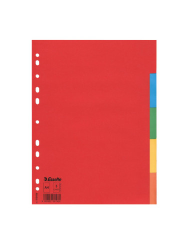 - Material: Cartón - Tamaño A4 - Multitaladro - 5 pestañas/5 colores - Presentación en bolsa individual