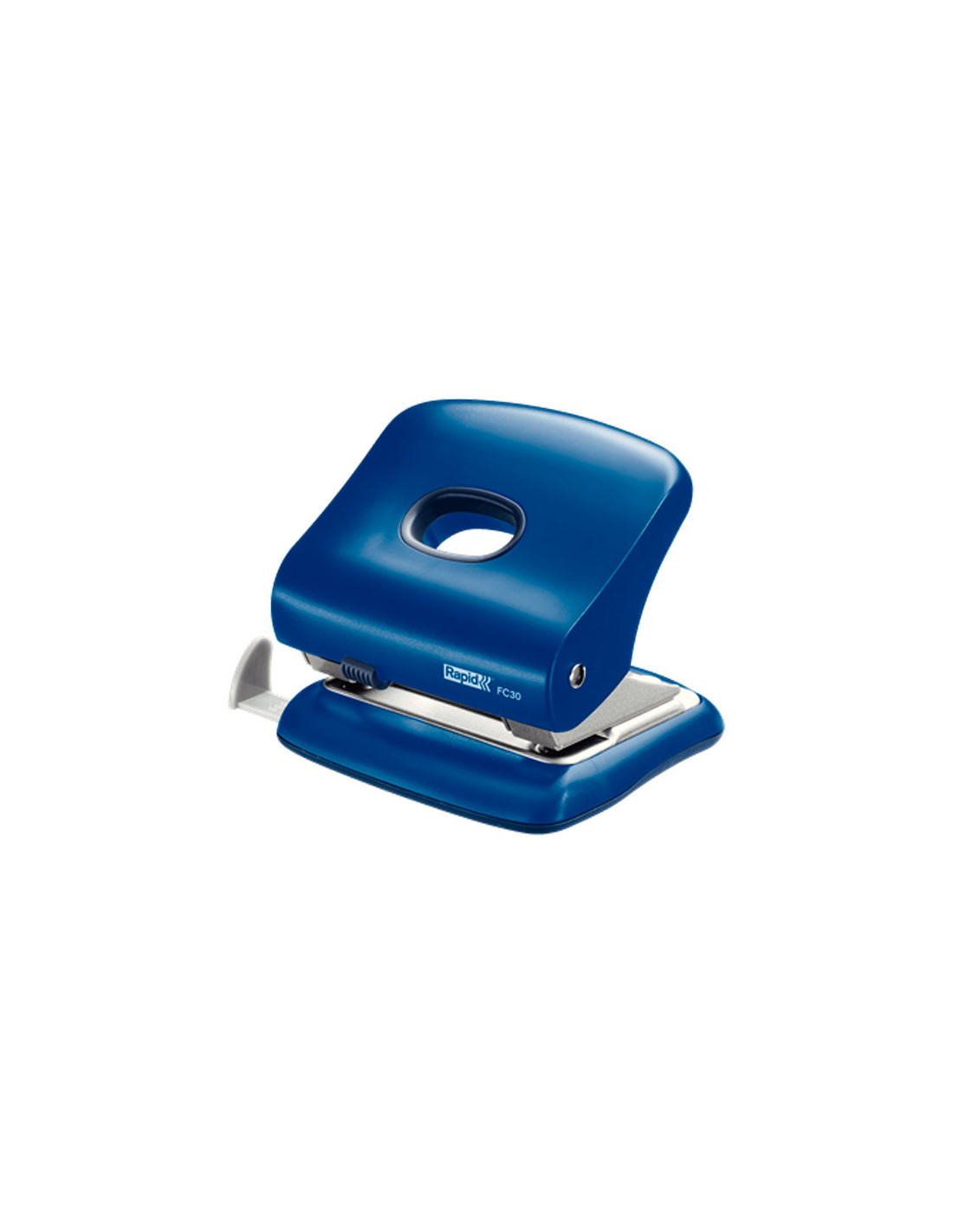 Taladro metálico con palanca y base de plástico reforzado. Capacidad de perforación de hasta 30 hojas. Perforadora de 2 taladros, distancia de 8cm. entre ellos. Cubeta integrada en la base de plástico, fácil de vaciar. Marca central y guía para el papel.